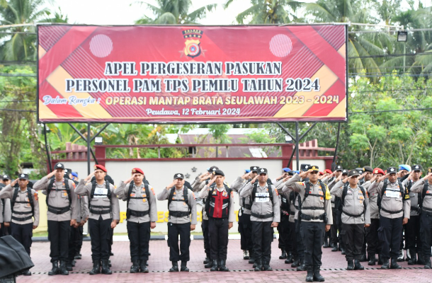 KABEREH NEWS | ACEH TIMUR -- Polres Aceh Timur Polda Aceh menggelar apel pergeseran pasukan personel pengamanan Tempat Pemungutan Suara (TPS) dalam Rangka Operasi Mantap Brata Seulawah 2023 - 2024. Apel dipimpin oleh Dirlantas Polda Aceh Kombes Pol Muhammad Iqbal Alqudusy, S.H.,S.I.K.. di Lapangan Sarja Arya Racana, Senin, (12/02/2024) pagi.